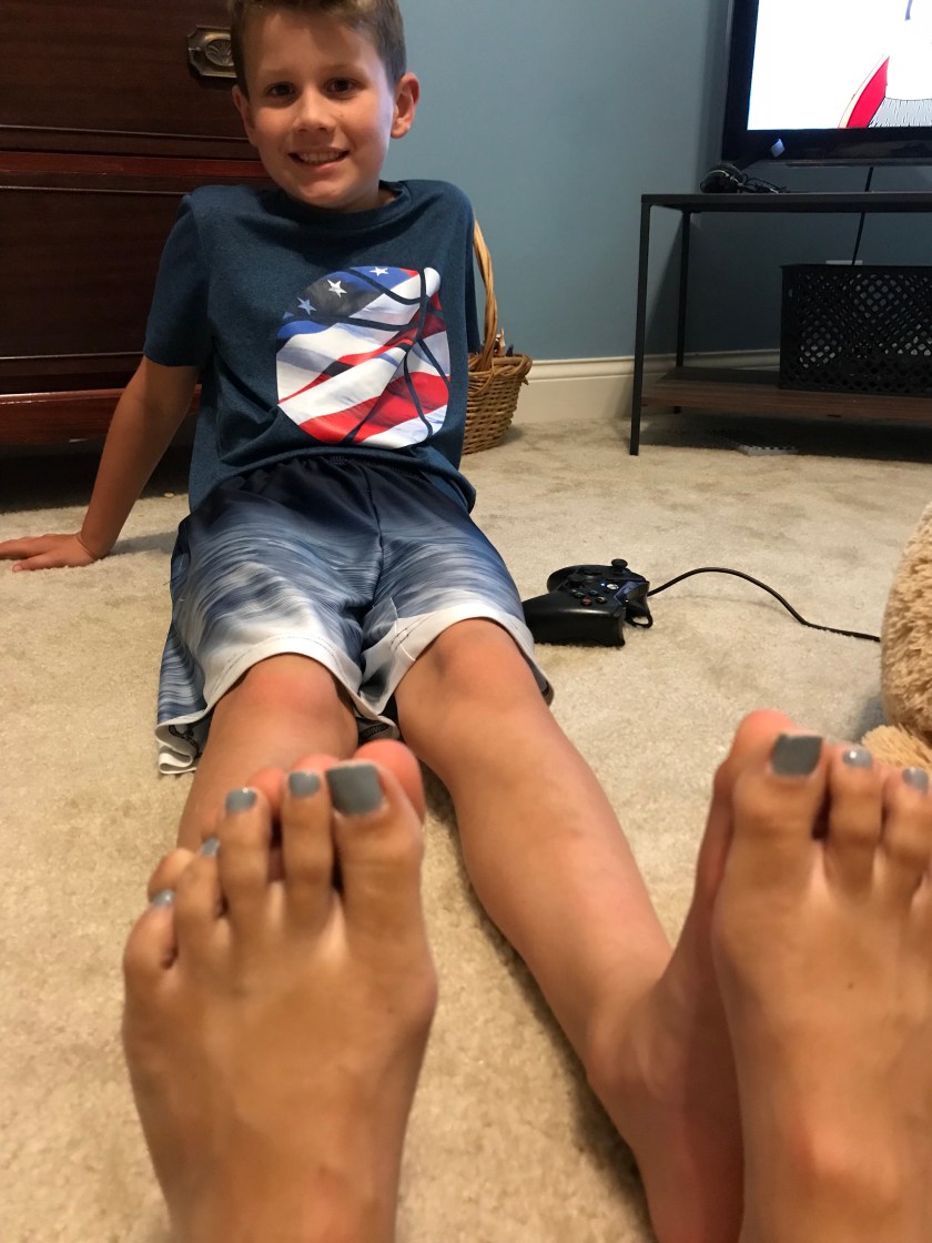 I’ve always had a thing for my kids and their shoes. When Talan was a baby/toddler, I’d always get him these soft sole Pumas. At one point I thought I’d save them and put them all in a shadow box to display at his High School graduation. Insert eye rolls and ‘you’ve gone crazy’ comments from my husband. But shoes are so symbolic to me. Their little feet. They show just how much they’ve grown. (Like thinking Talan could wear his basketball shoes from winter league basketball for basketball camp this last week. And having to get him a pair of shoes a whole size and a half bigger…with having to ask if he could just make it through his first day in his old shoes. Mom fail right there.) And now…this mama can fit into her 9 year old son’s school shoes. I never thought this day would come! (I do have small feet, but still!) I’m wearing my son’s shoes. Cue all the tears.