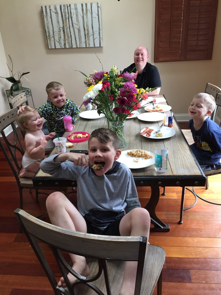 They got home and Trav made breakfast. We had a Mother’s Day Miracle with Grayson James eating scrambled eggs and bacon. The kid has been living off of cheerios and milk, fruit, buttered noodles, and crackers for 6 years, so it’s only normal that he would have a tummy ache, as his tummy was probably wondering what the heck just happened!