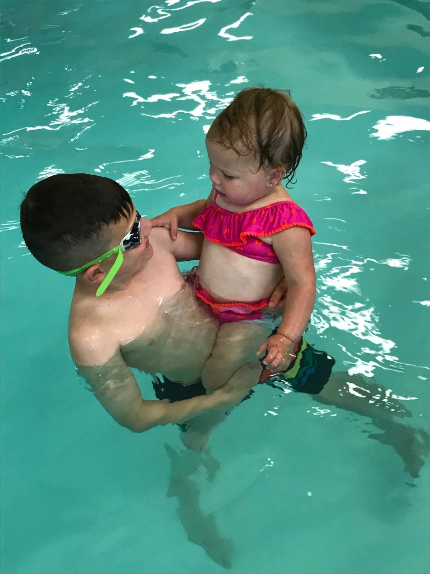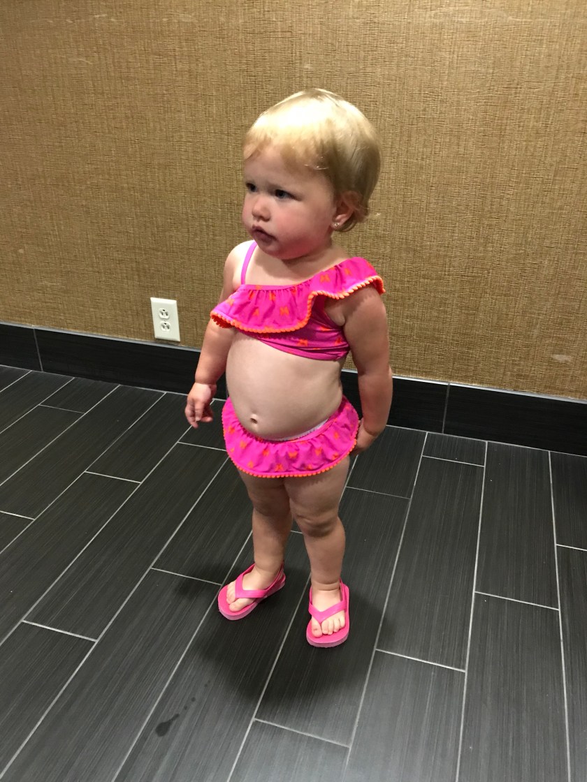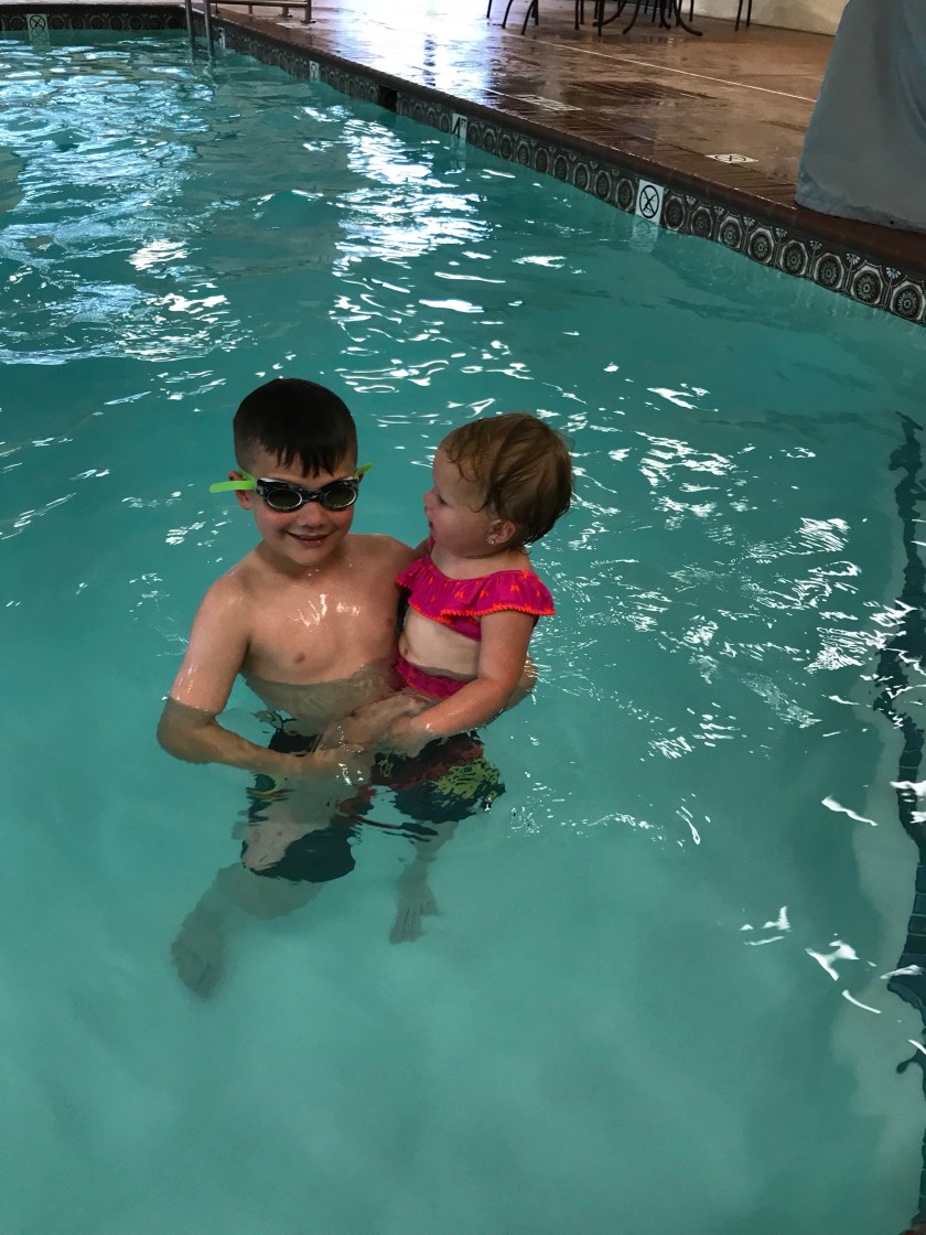 Example #1: I didn’t think Isla would go in the pool at the hotel because she hasn’t really liked any splash pads we’ve been to. Because of this assumption, I didn’t put my swimsuit on. Big mistake. She LOVED the pool and I had to be right there because she would jump in on her own if Trav was taking too long with one of the other kids. After a while she wanted nothing to do with Daddy (sorry Trav), and would only jump in to Talan or be carried around by Talan. We’re currently battling the screaming phase if she doesn’t like something. Which means she would scream if anyone else tried touching her. Insert mama eye roll. Definitely something we dislike, but my point is…Talan is her favorite. (Don’t tell G. He says he’s her best friend and always whispers to me that he thinks she likes him best.)